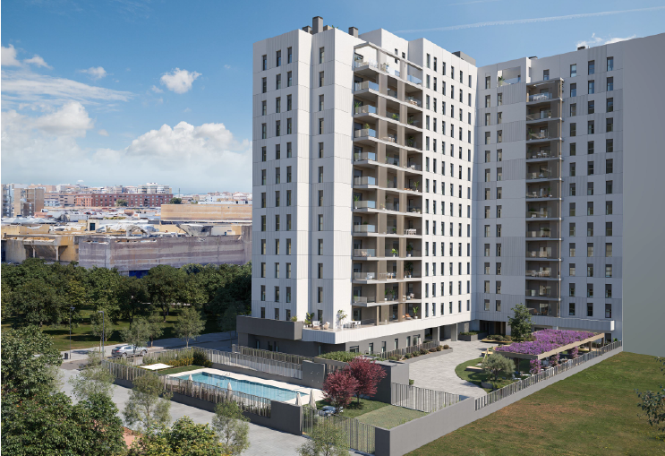 El conjunto residencial está compuesto por 46 viviendas plurifamiliares de 1 a 4 dormitorios, distribuidas en dos bloques de planta baja más cinco alturas. Todas las unidades cuentan con garaje y trastero, además de amplias terrazas y solárium en los áticos. Las zonas comunes incluyen piscina, área infantil y espacios ajardinados.