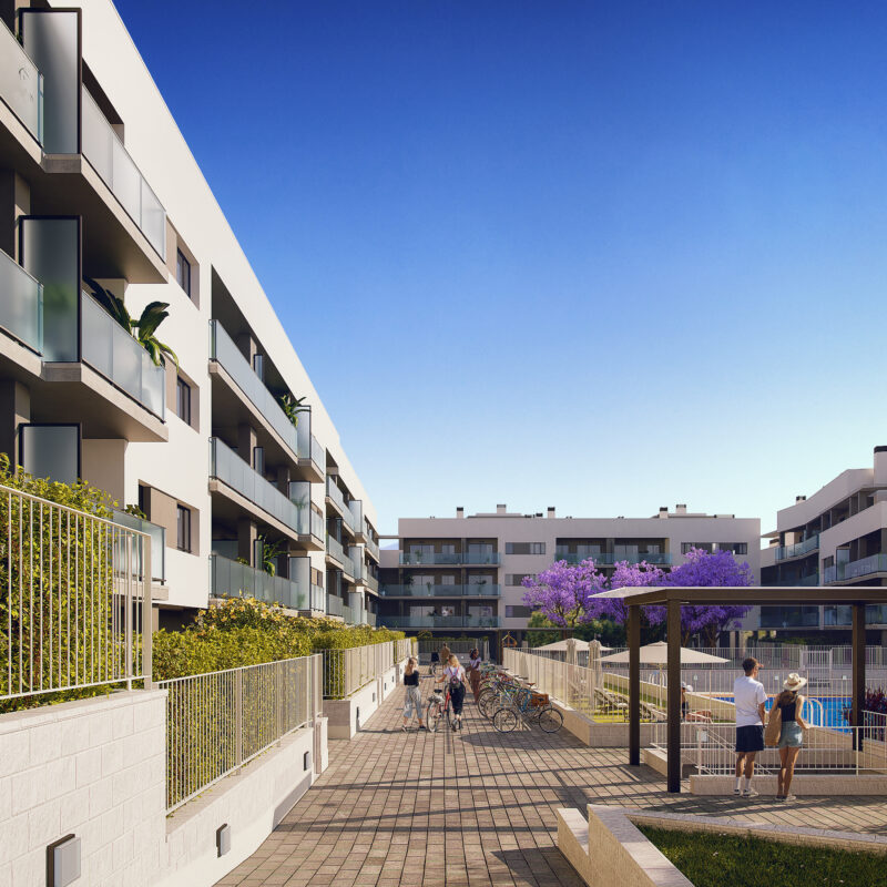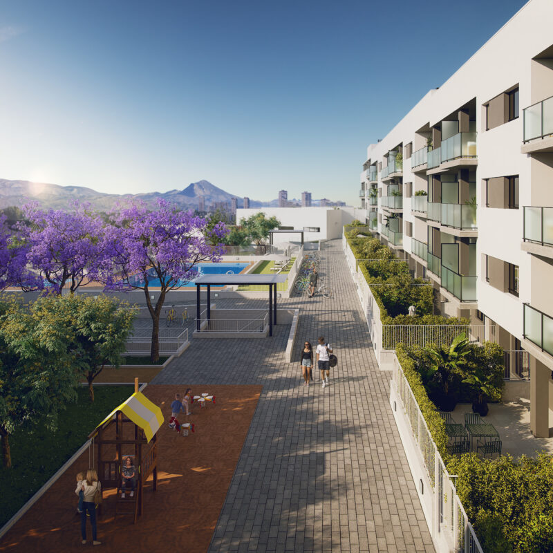 99% SOLD - ADVANCED WORKS. Residential complex of 89 homes with swimming pool for children and adults, playground and large gardens, located in the new neighborhood of Nou Nazaret in Sant Joan d'Alacant, 2km from the beach of San Juan and 15min drive from the center of the city of Alicante, with all the services of a large capital and the tranquility of a small town, with many schools and shopping areas in the vicinity and the University Hospital of Sant Joan at 850m. From Nou Nazaret there are quick connections to the N-332 and the A-7 freeway and the A-70 ring road with access to El Altet airport in 25 minutes. Metrovacesa has in this promotion of first floor apartments with large terraces and private garden, ground floor apartments with through distributions and terrace, typologies of 2, 3 and 4 bedrooms, communal garage and storage room. In Sant Joan you will be "close to everything", near the sea, the city and the mountains and close to important towns such as Mutxamel, El Campello, Villajoyosa or Xixona. In addition, you will enjoy the rich cultural activity of the municipality with multiple popular festivals of medieval origin, mostly music and dance as the main exponents. Sant Joan de Alacant takes care of its environment and the City Council stands out for the protection of its most unique trees and the biodiversity of birds, among other measures to increase the quality of life of people.