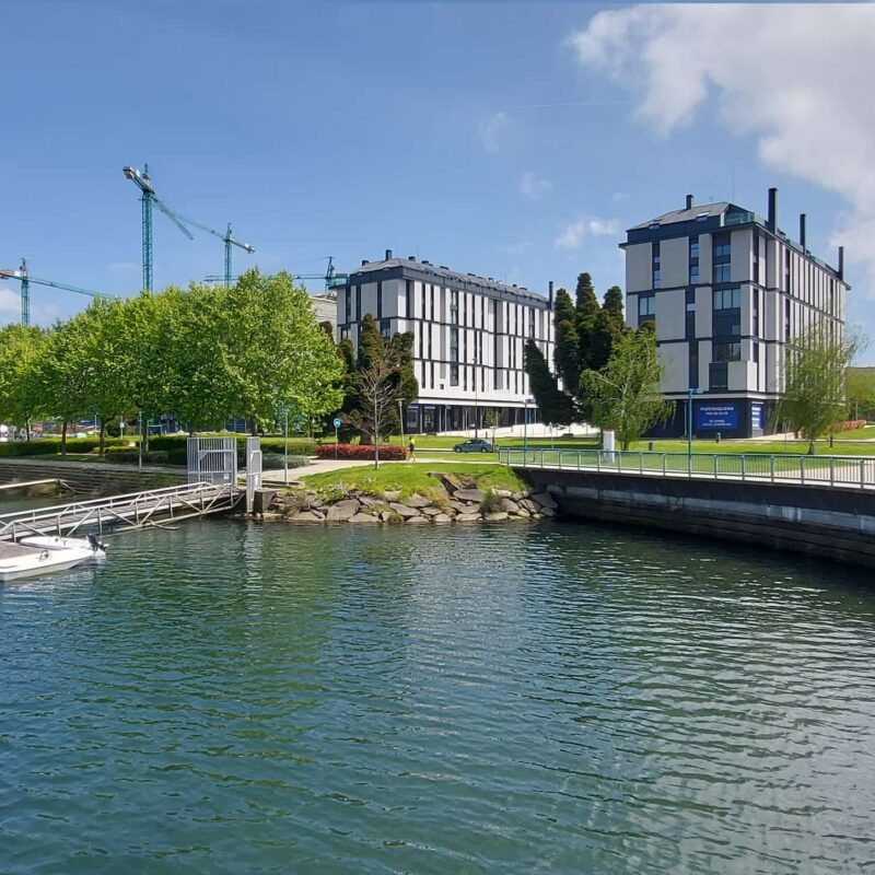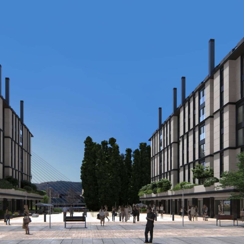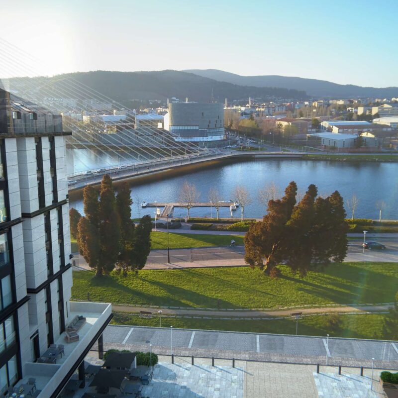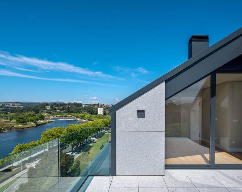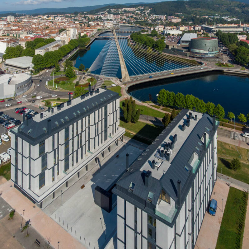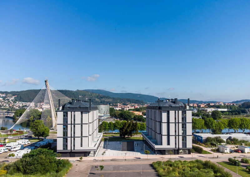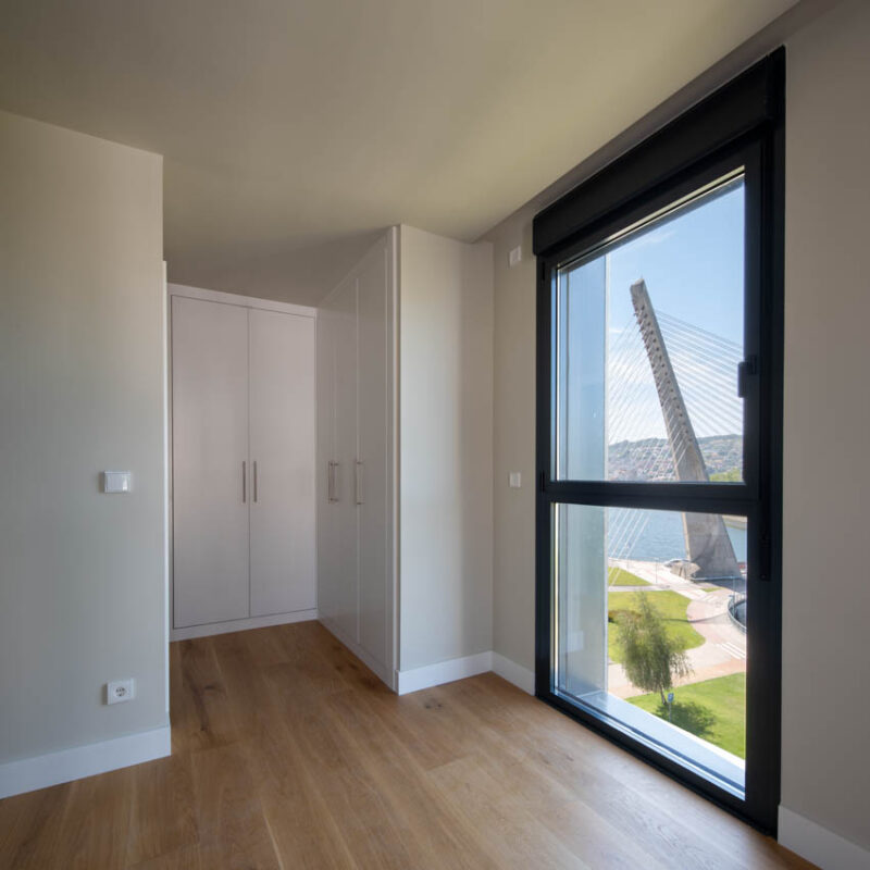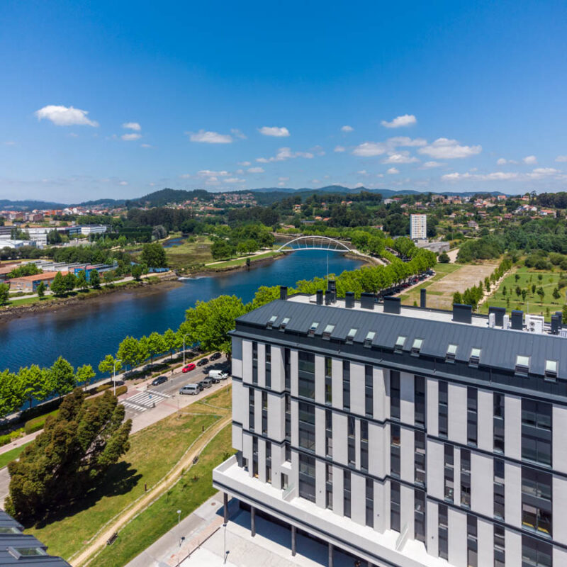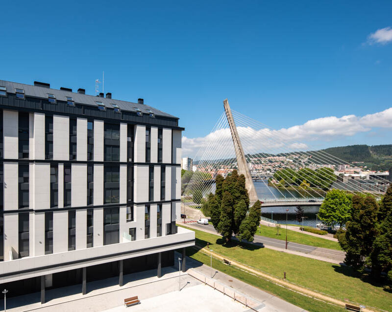 Residential complex of 91 homes of 1, 2, 3 and 4 bedrooms with impressive penthouses with terraces. It consists of 2 buildings of 8 floors (B.P.+6 + penthouse) located next to the Lérez river and with magnificent views of the estuary. The homes will have parking spaces and storage rooms and will be equipped with excellent communal services (heated swimming pool, gym, social and gourmet lounge).
