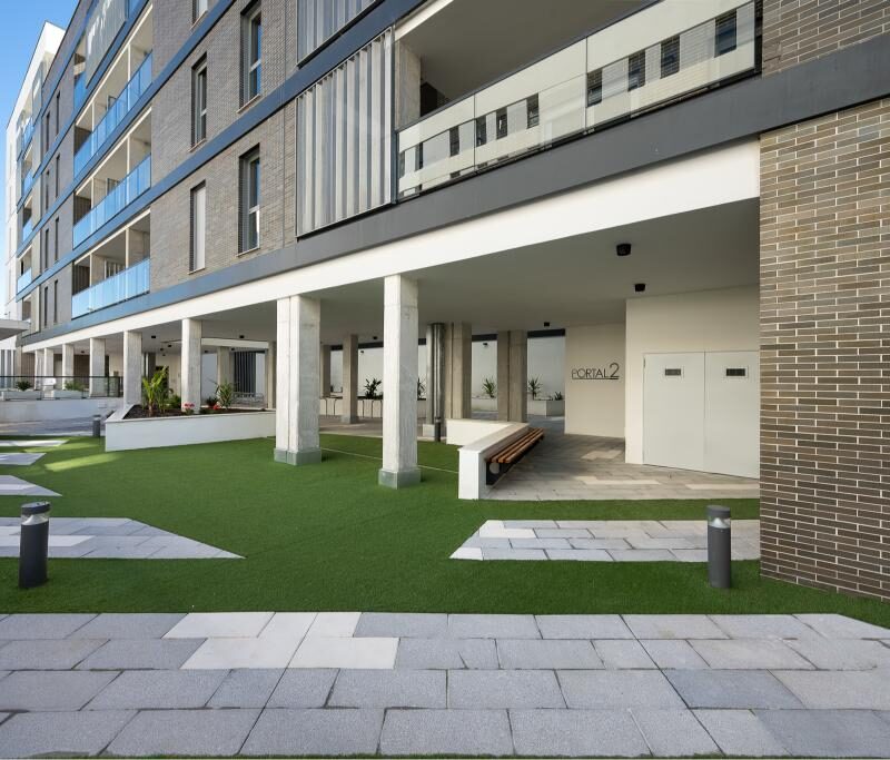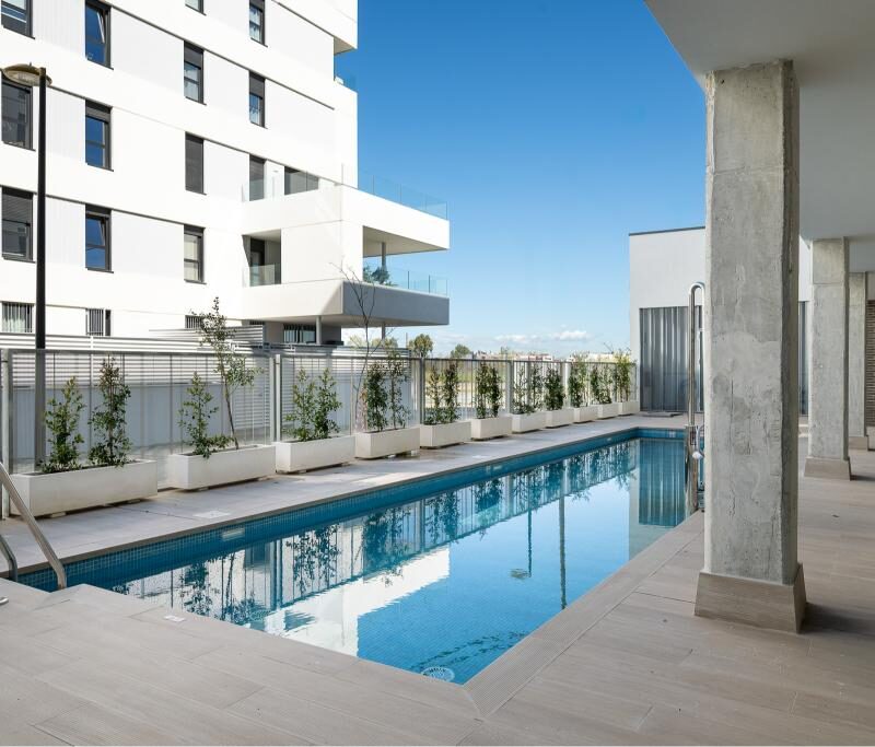 The development is made up of 46 homes. PALMAS ALTAS-ISLA NATURA. Enjoy a new way of living in Seville. Perfect and fast communications. It is developed in two blocks of multi-family dwellings and commercial premises, differentiated by a common transit area, consisting of these blocks of ground floor plus 5 floors in height until reaching the penthouses, and being its typology developed in 8 houses of 1 bedroom, 16 of 2 bedrooms, 8 of 3 bedrooms and finally 14 of 4 bedrooms, all of them with large terraces. The development is completed with a basement with 65 parking spaces and 3 commercial premises on the first floor. Communal swimming pool on the first floor with easy access and ample spaces. Promotion under construction. It is your life, choose where to live it. The homes are sold together with a parking space and a storage room with prices from 12,500 € and 3,500 € respectively.