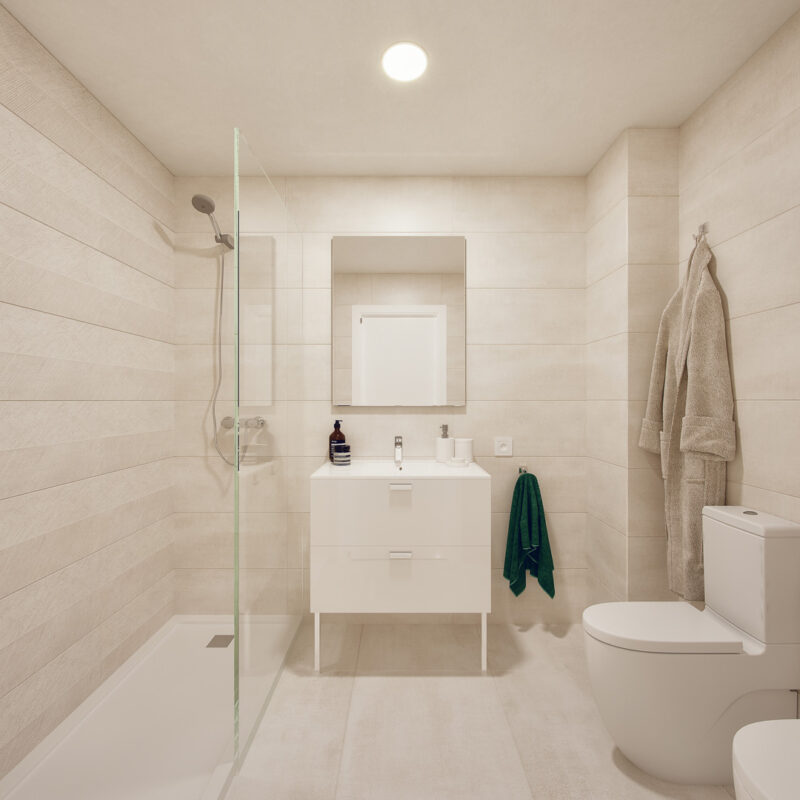 Un espacio privado para tu bienestar. Baños con acabados modernos y elegantes, donde cada detalle está pensado para tu comodidad.