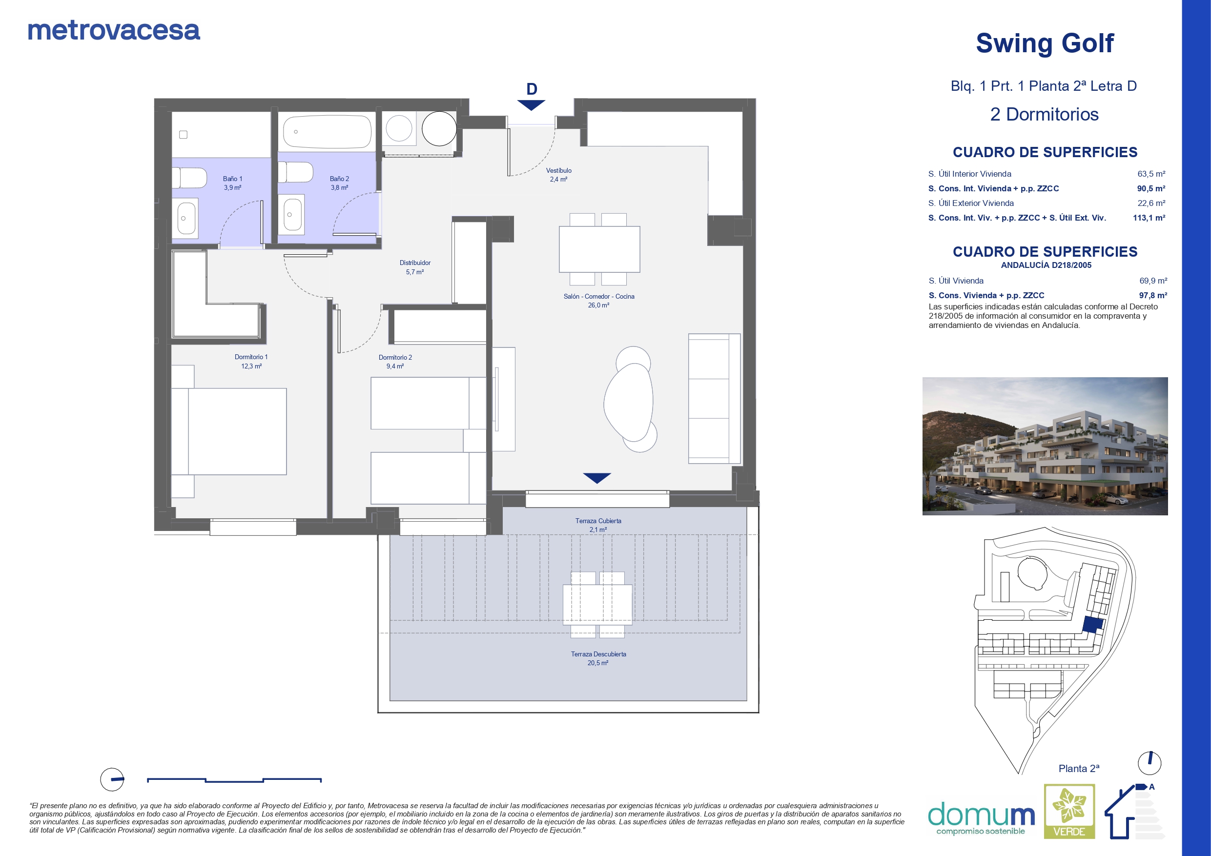 Este moderno complejo está compuesto por 54 viviendas de 1, 2 y 3 dormitorios, todas ellas con plaza de garaje y trastero incluidos. Las viviendas han sido diseñadas con un enfoque contemporáneo y funcional, y cuentan con amplias terrazas con vistas al campo de golf y al mar, ideales para disfrutar del clima mediterráneo y el entorno natural.