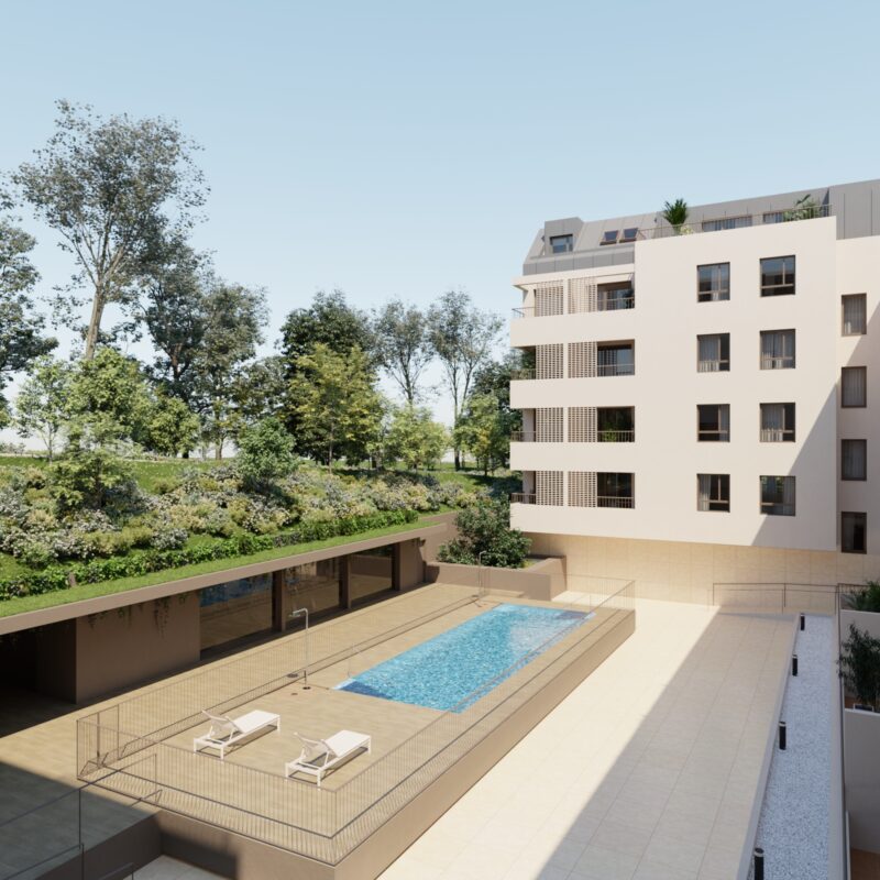 Un oasis de tranquilidad. Relájate y disfruta del sol junto a nuestra piscina, diseñada para que cada día se sienta como vacaciones. Calidad de vida en tu nuevo hogar.