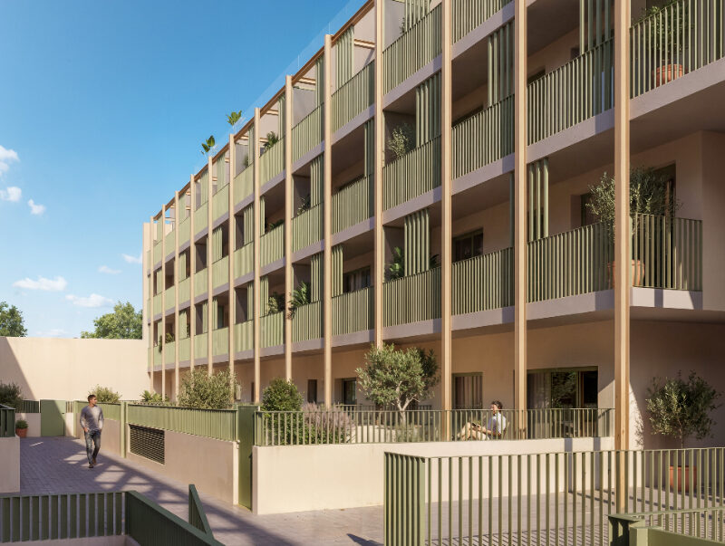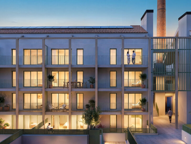 El conjunto pone en valor el patrimonio industrial existente mediante la integración de las fachadas y la chimenea histórica del antiguo Vapor de Ca l’Escardat, aportando carácter e identidad al proyecto.