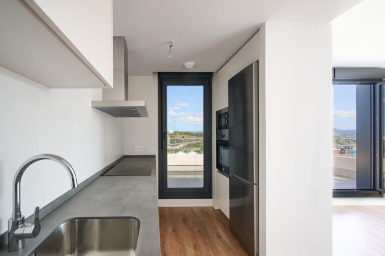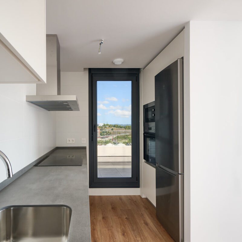 La vivienda, en planta 9º, se abre hacia el parque lo que garantiza amplitud de vistas, luminosidad y privacidad y cuenta además con doble orientación. A su terraza solárium se accede desde la cocina y desde el salón, el cual dispone además de dos amplios ventanales para crear ambientes agradables y luminosos. La cocina está equipada con mobiliario de líneas rectas, encimera porcelánica y los siguientes electrodomésticos: frigorífico, horno, microondas, placa de inducción, campana extractora y lavavajillas. Destacan sus distribuciones interiores y unos diseños y materiales que enamoran. Las soluciones constructivas aúnan un óptimo mantenimiento y durabilidad con altas prestaciones de confort térmico y acústico: máxima calificación de eficiencia energética Nivel A, calefacción por suelo radiante, excelentes aislamientos térmo-acústicos, doble orientación en todas las viviendas, carpintería exterior de PVC con acristalamiento doble, cocinas equipadas, armarios empotrados ¡Y mucho más!