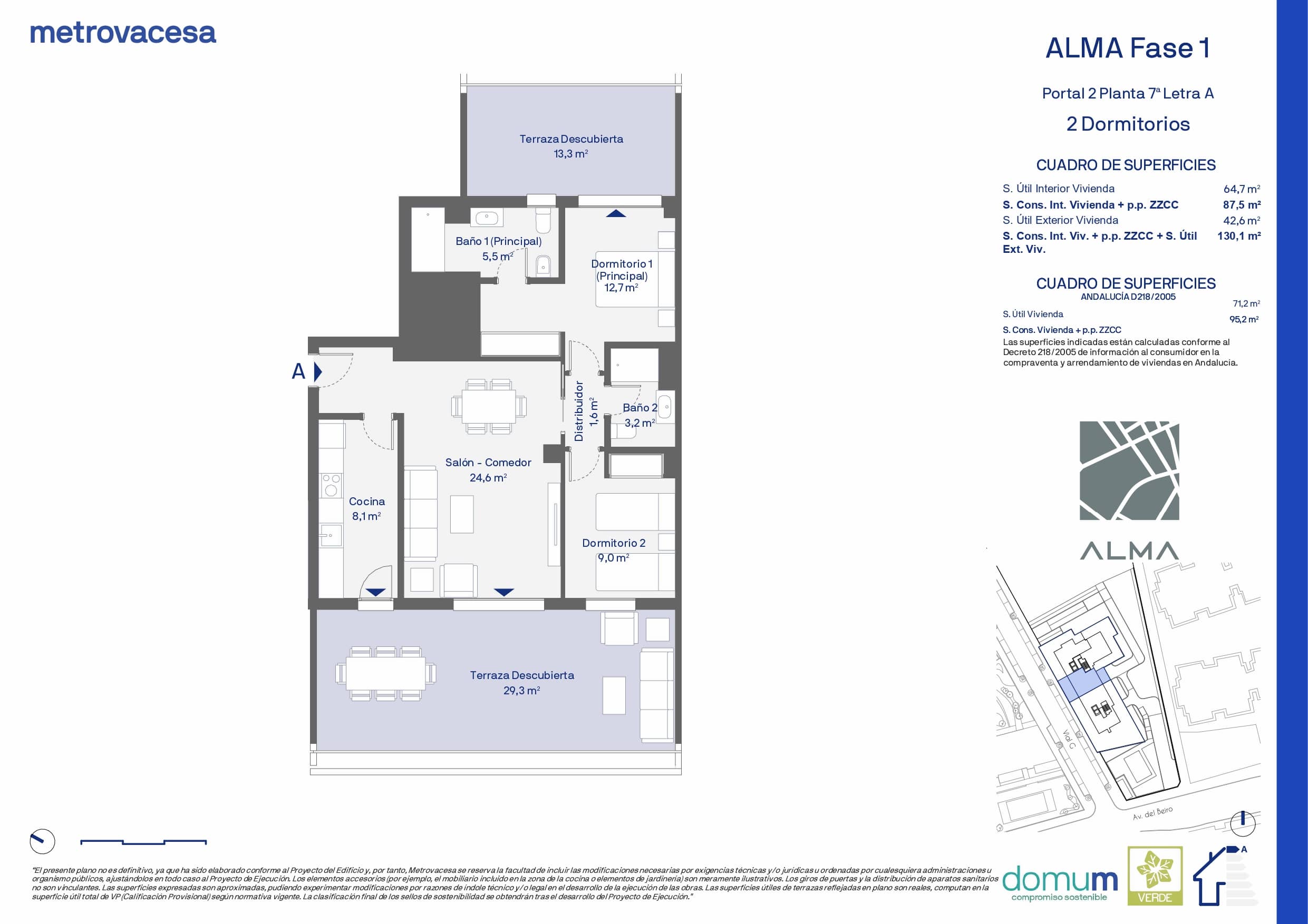 En línea con su apuesta por la sostenibilidad y el confort, este residencial cuenta con calificación energética A tanto en consumo de energía primaria no renovable como en emisiones de CO₂, además de Sello Verde, Compromiso Domum y Análisis de Ciclo de Vida (ACV), incorporando soluciones orientadas a la eficiencia energética, la gestión responsable de los recursos hídricos y la reducción del impacto ambiental.
