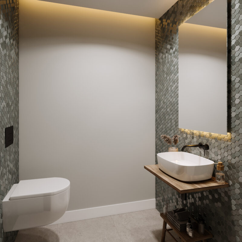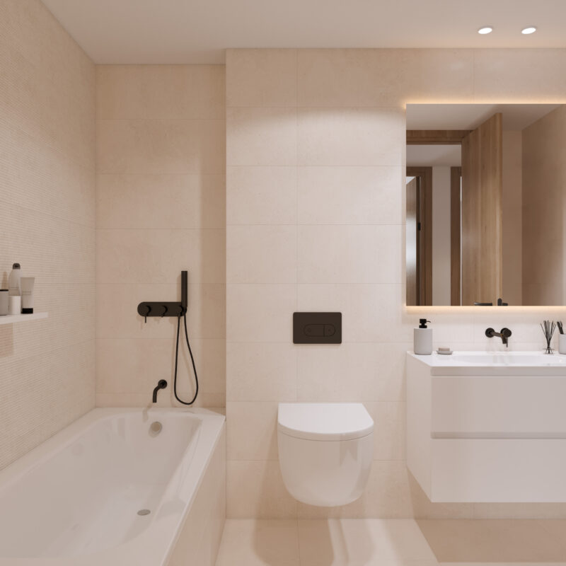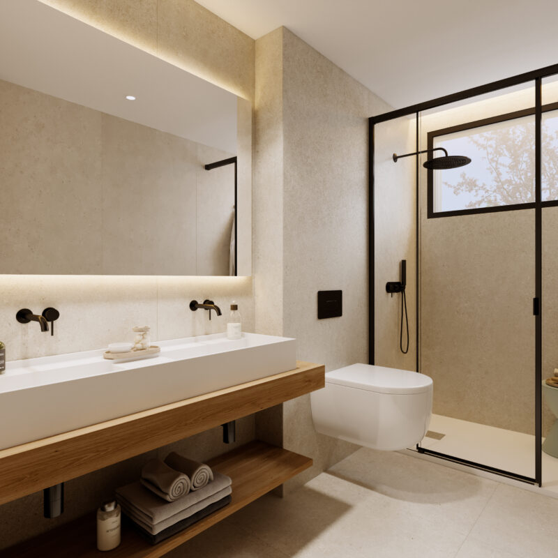 Un espacio privado para tu bienestar. Baños con acabados modernos y elegantes, donde cada detalle está pensado para tu comodidad.