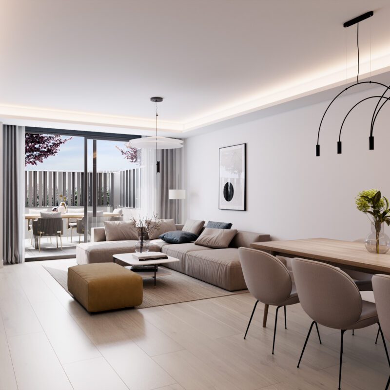 Adaptadas a las nuevas necesidades que exige el mercado actual, las viviendas contarán con grandes terrazas, plazas de garaje y trastero. Los salones cuentan con grandes ventanales para crear ambientes agradables y luminosos y generosas terrazas para disfrutar de unas vistas despejadas.