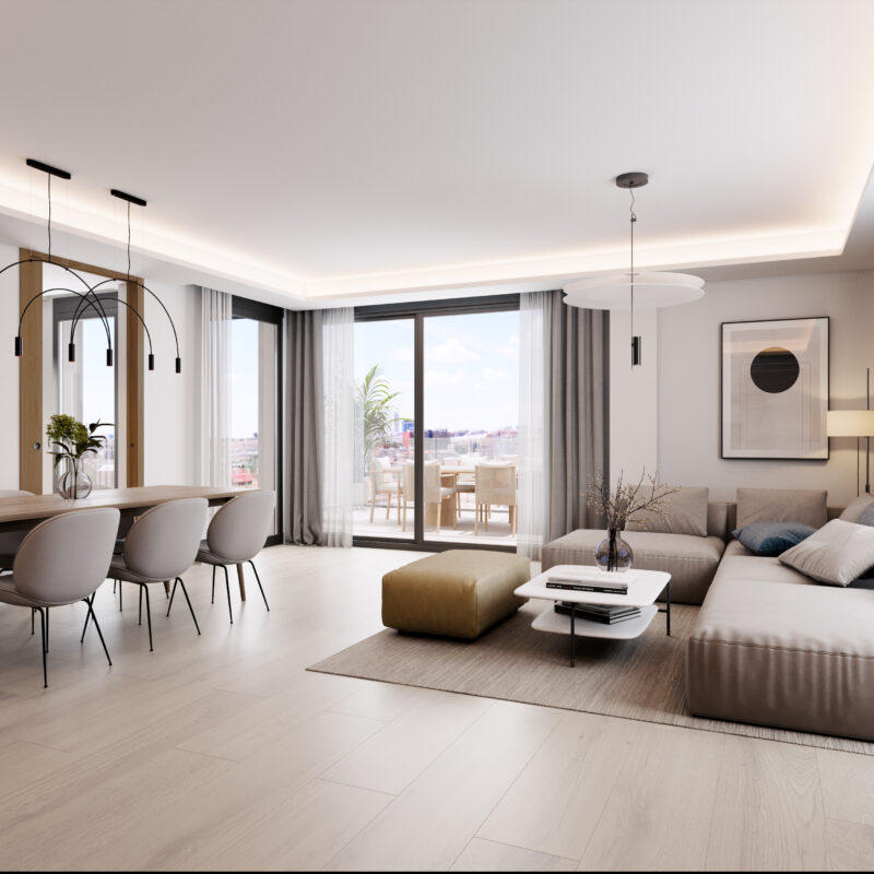 Adaptadas a las nuevas necesidades que exige el mercado actual, las viviendas contarán con grandes terrazas, plazas de garaje y trastero. Los salones cuentan con grandes ventanales para crear ambientes agradables y luminosos y generosas terrazas para disfrutar de unas vistas despejadas.