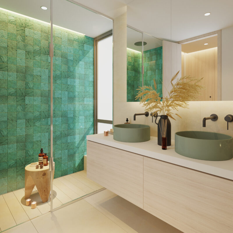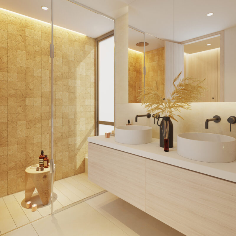 Un espacio privado para tu bienestar. Baños con acabados modernos y elegantes, donde cada detalle está pensado para tu comodidad.