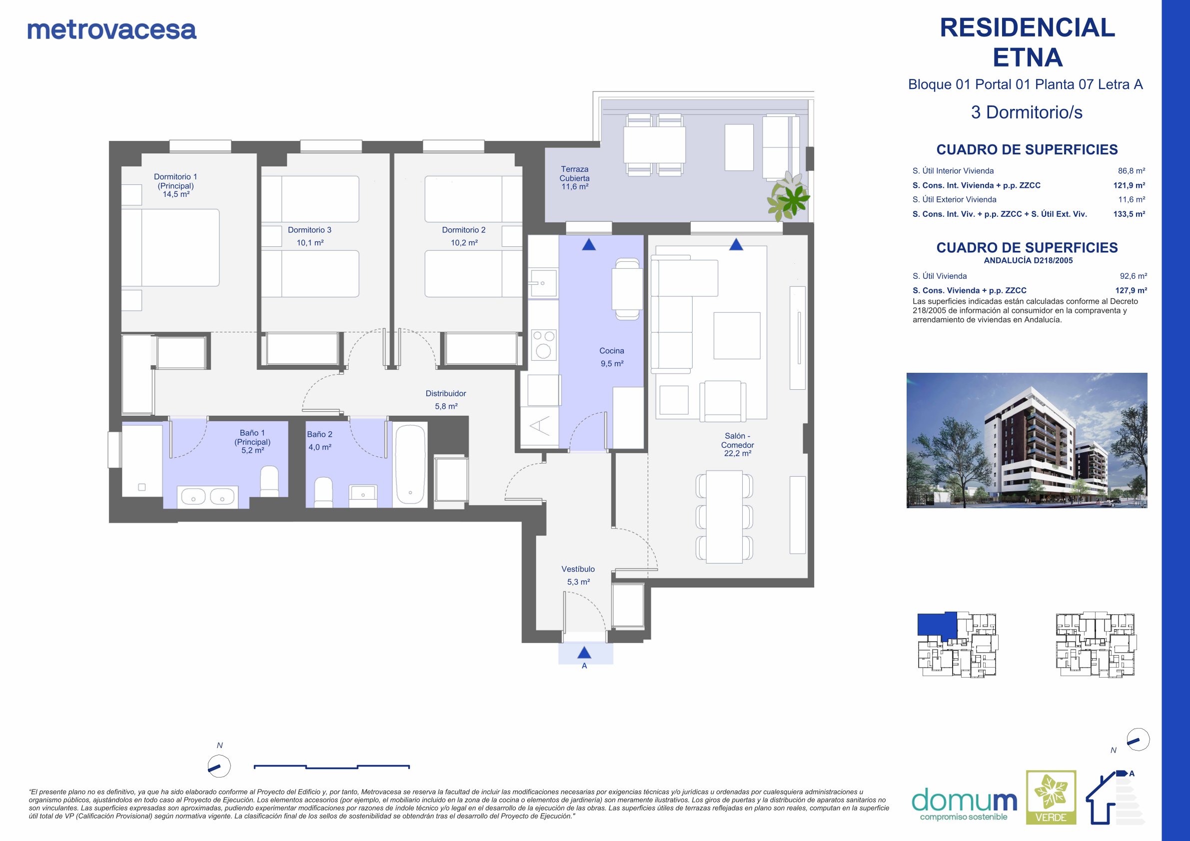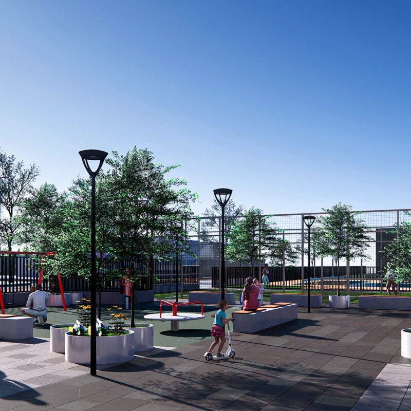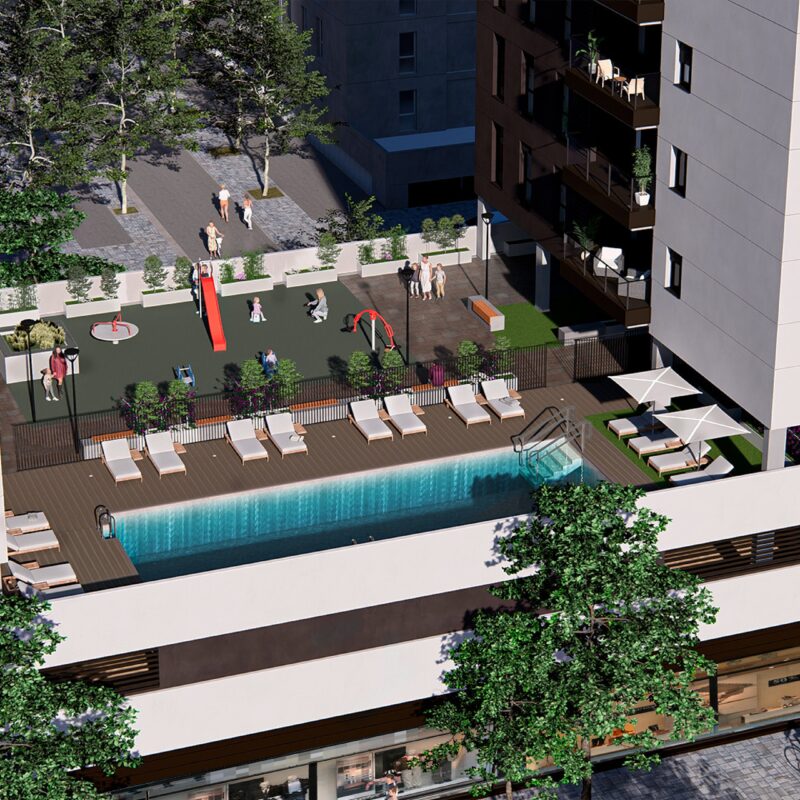 Residencial Etna dispondrá en planta baja de una zona de esparcimiento, juego de niños y pista de pádel privada. Además, en línea con el compromiso de sostenibilidad de METROVACESA presente en ISLA NATURA, la promoción contará con las certificaciones ACV, DOMUN y el sello verde GBCE que garantiza el mínimo impacto ecológico de nuestras construcciones.