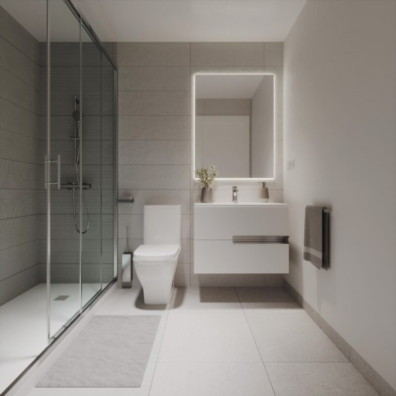 Un espacio privado para tu bienestar. Baños con acabados modernos y elegantes, donde cada detalle está pensado para tu comodidad.