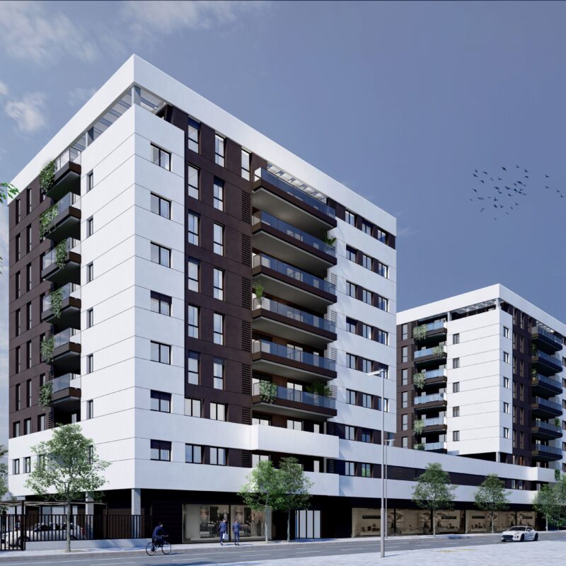 Residencial Etna. Conjunto residencial compuesto por 74 magnificas viviendas de 1 a 4 dormitorios, amplios salones, cocinas amuebladas y terrazas en todas ellas. Las viviendas están distribuidas en 2 edificios, cada uno de ellos con 37 viviendas y que se levantan a ambos lados de la zona comunitaria de piscina situada en segunda planta del conjunto.