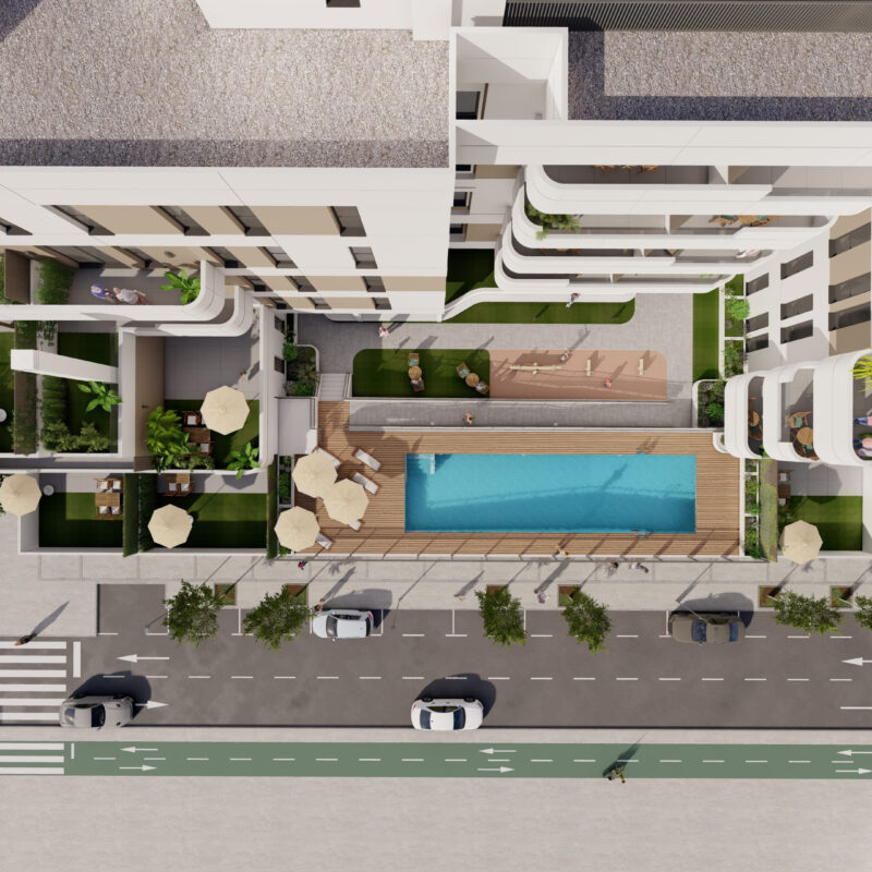 Residencial Moncayo está configurado como un edificio abierto al Este, aterrazado y en cuyo centro se encuentran las zonas comunes y su piscina comunitaria. Además, cuenta con un diseño contemporáneo donde prima la funcionalidad y la optimización del espacio.