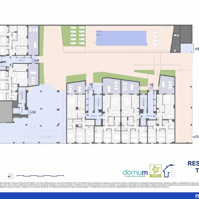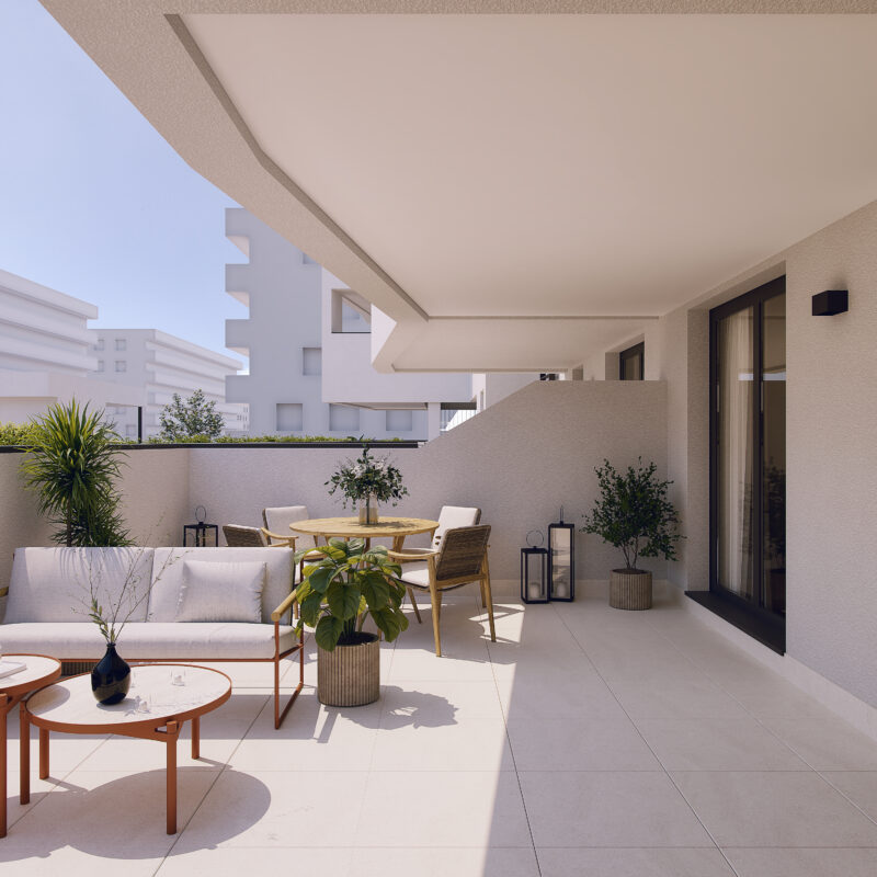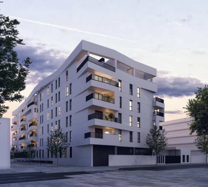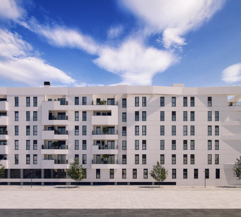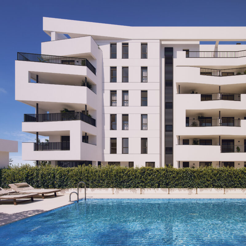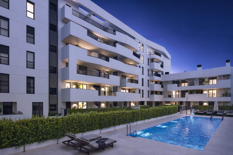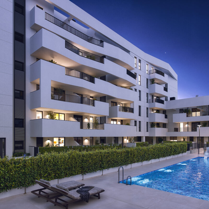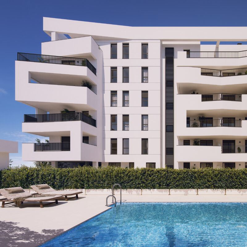 Promoción plurifamiliar de 54 viviendas de 2, 3 y 4 dormitorios con garaje y trastero en Palmas Altas (Isla Natura). Dispone de amplias terrazas, zonas comunes con piscina, sala comunitaria, y juegos infantiles. Cuenta con certificación energética A+A y sellos de sostenibilidad.