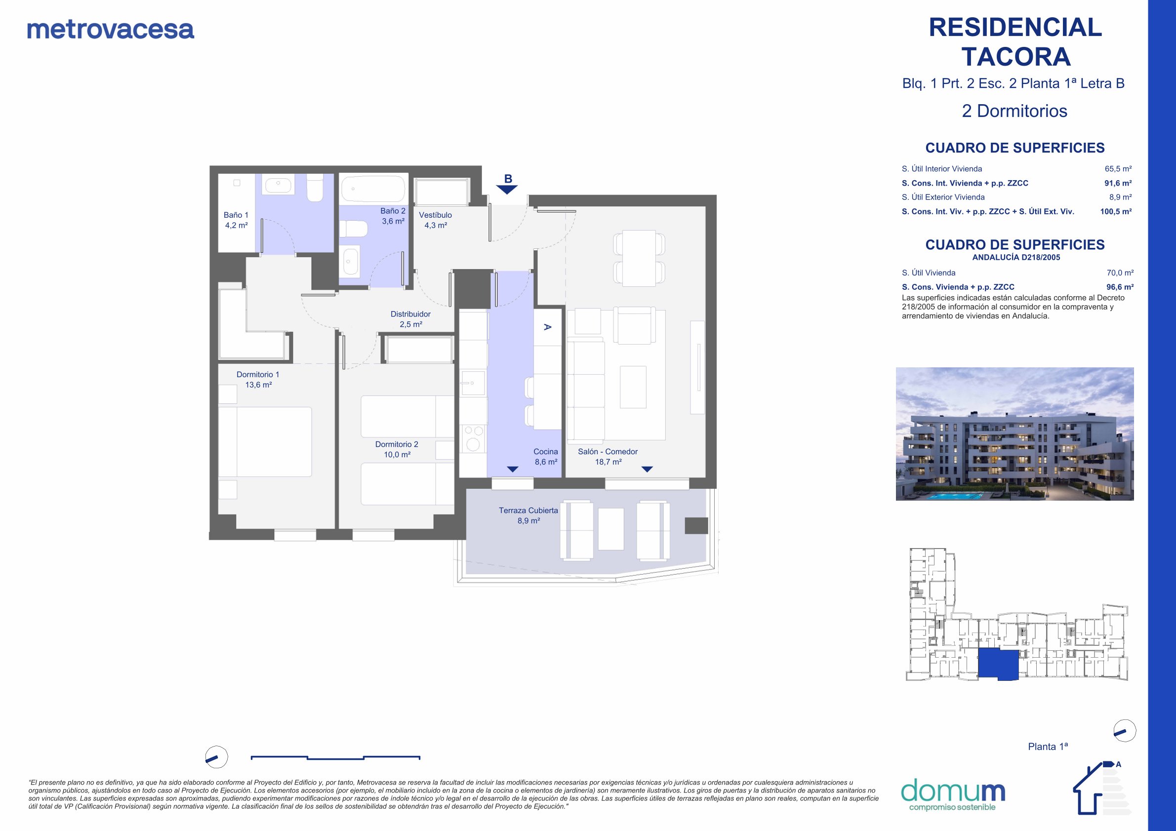 Residencial Tacora consta de 54 viviendas, de 2, 3 y 4 dormitorios, con plazas de garaje y trastero. El conjunto se ha diseñado en dos volúmenes, uno de Planta Baja+5 y otro de Planta Baja+2, para optimizar la iluminación natural y el soleamiento, ofreciendo un elevado nivel de confort en todas las viviendas.