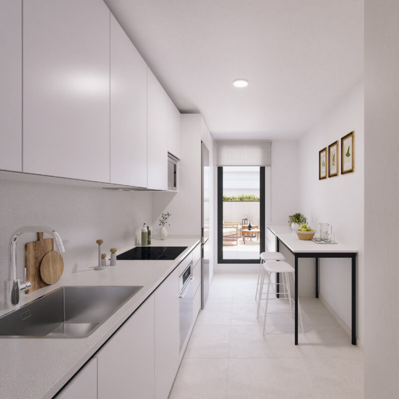 Las viviendas están distribuidas en ambos edificios y disponen de doble fachada, lo que favorece la ventilación cruzada y un óptimo soleamiento. También cuentan con amplias terrazas en las mejores orientaciones, creando espacios luminosos y funcionales. Ofrecen la posibilidad de personalizar acabados y estancias como las cocinas, a través de un sistema de elección de calidades.