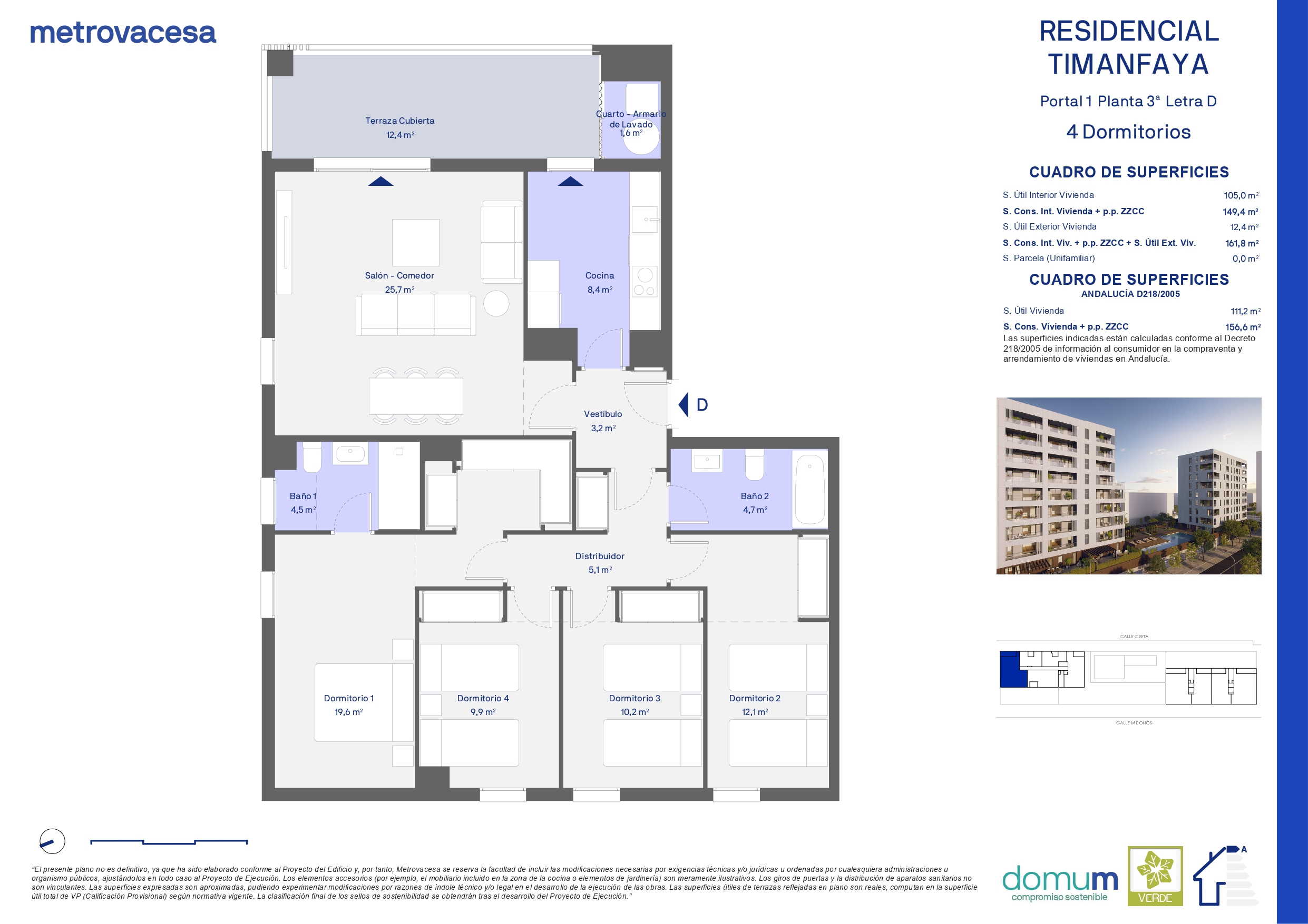 Esta nueva promoción, en línea con el compromiso de sostenibilidad de Metrovacesa en Isla Natura, contará con las certificaciones ACV y DOMUN, que garantiza el mínimo impacto ecológico de nuestras construcciones.