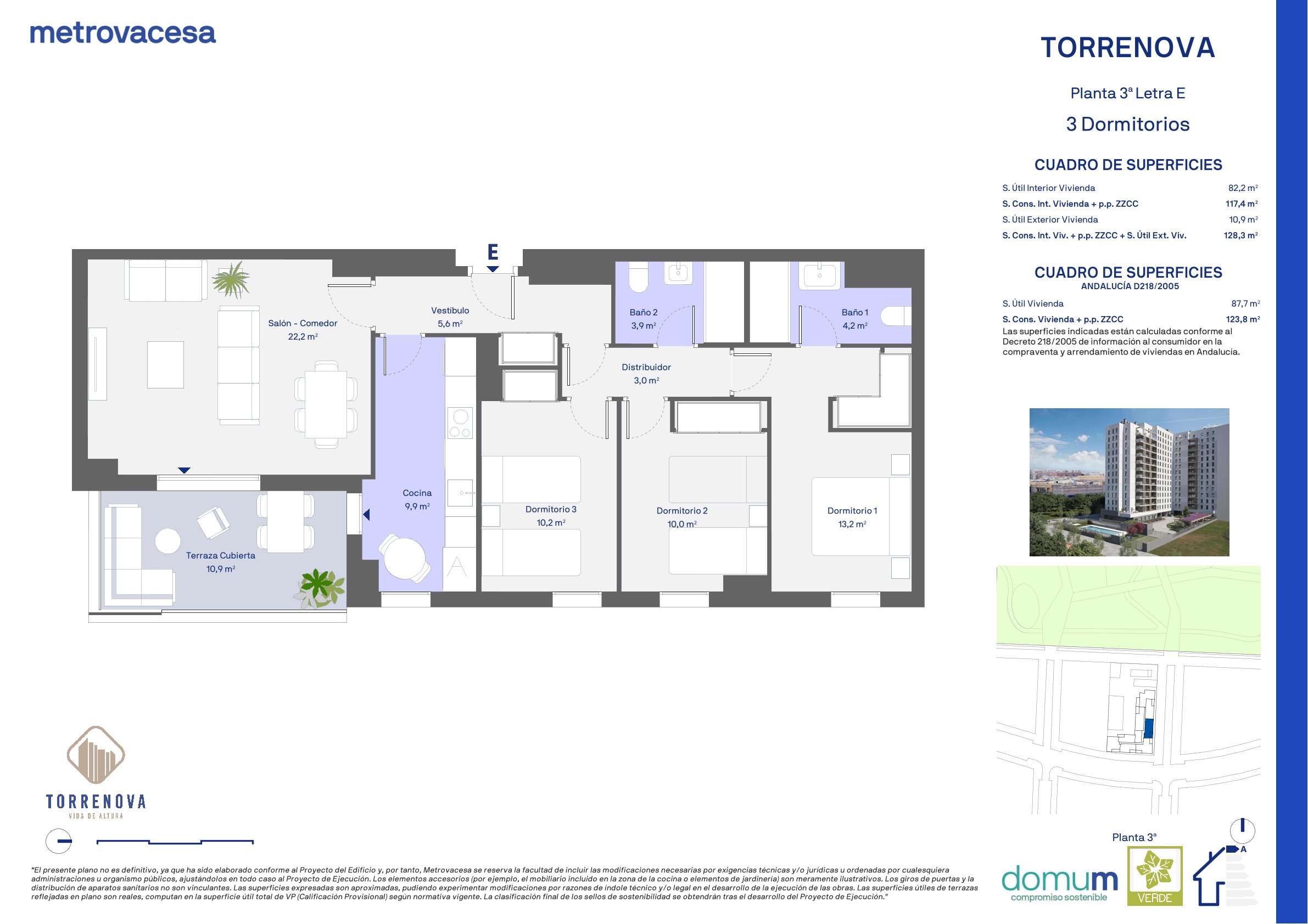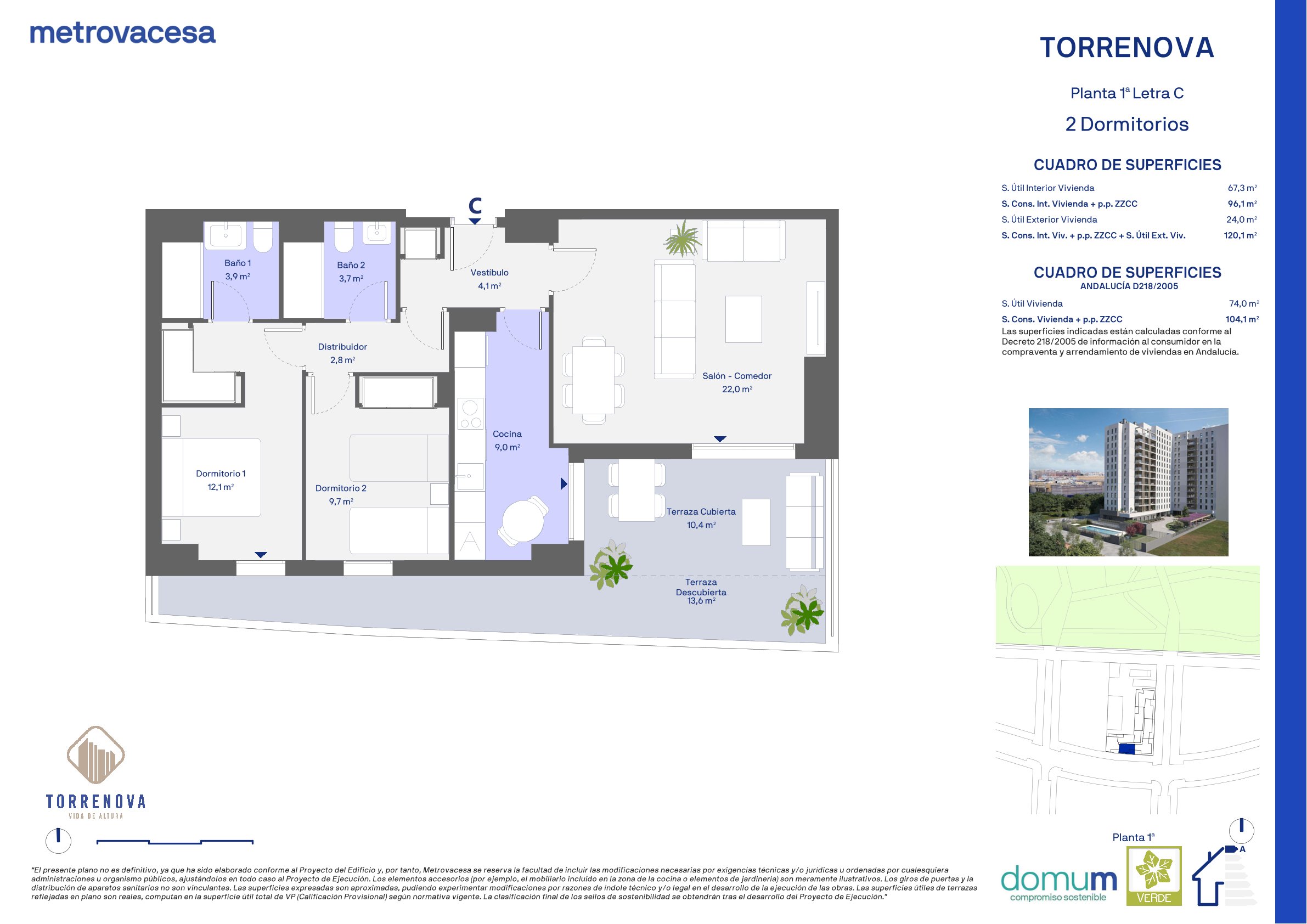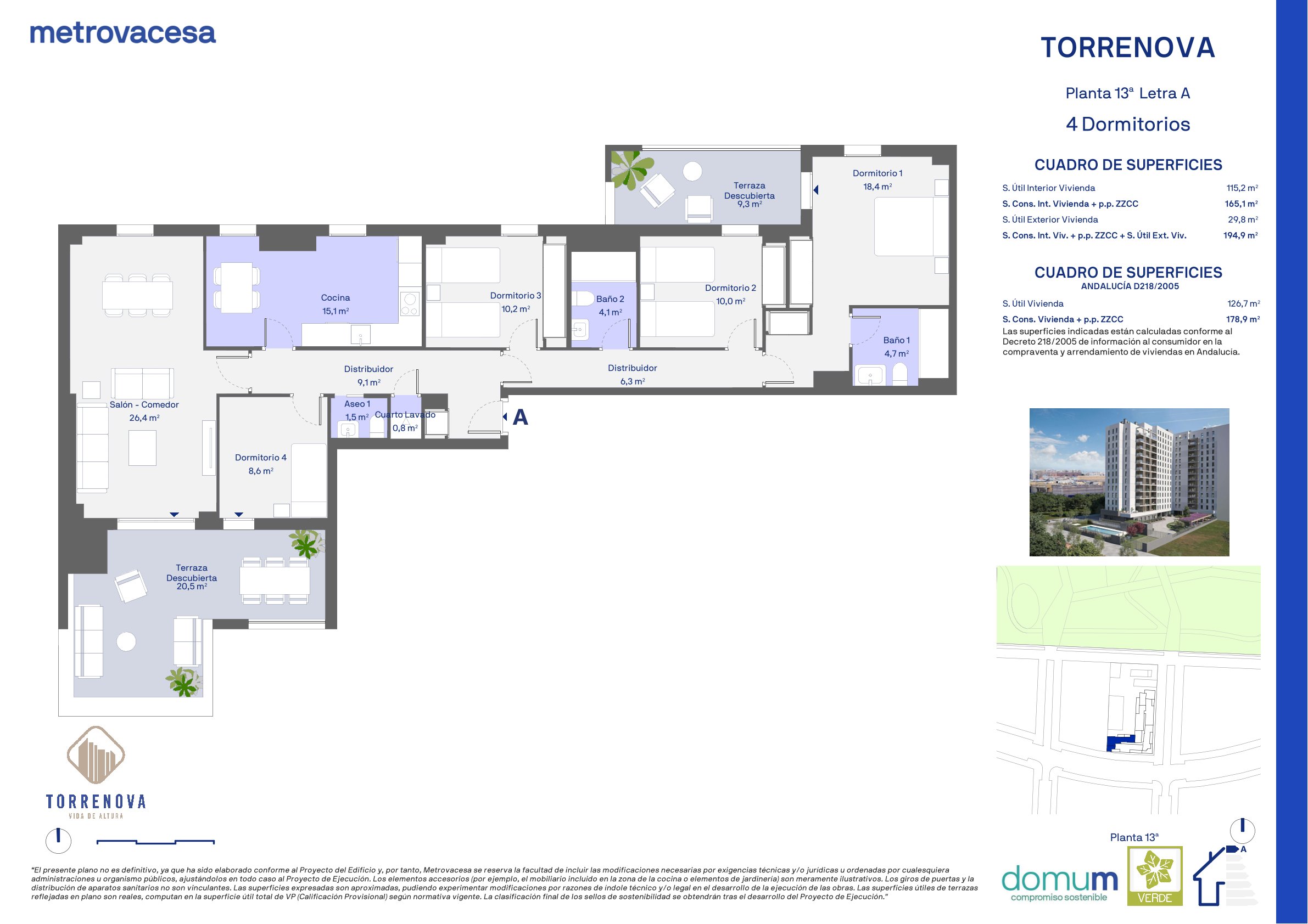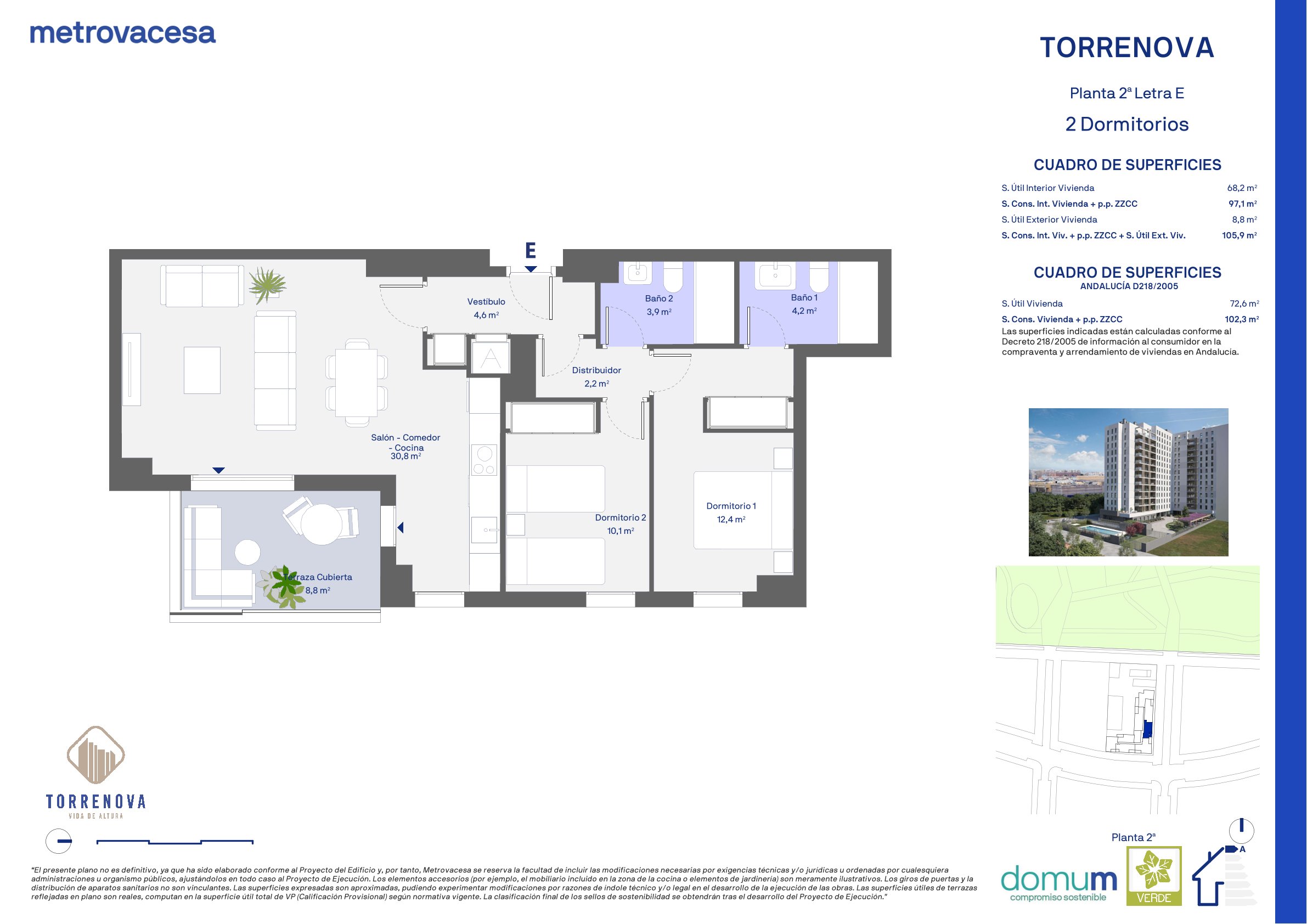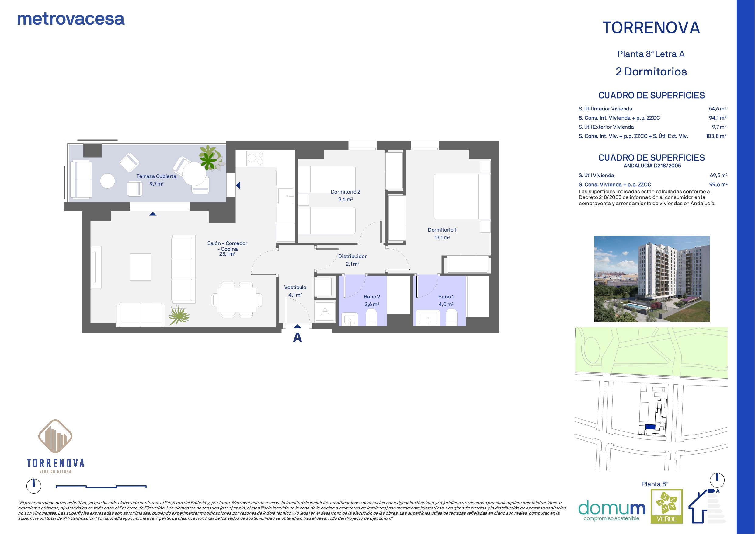 Diseñado con los estándares de calidad y sostenibilidad propios de Metrovacesa, con el valor añadido de certificación sostenible con Sello Verde (GBCe), y Domum de Metrovacesa.