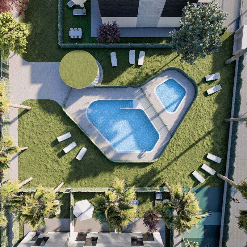Un oasis de tranquilidad. Relájate y disfruta del sol junto a nuestra piscina, diseñada para que cada día se sienta como vacaciones. Calidad de vida en tu nuevo hogar.