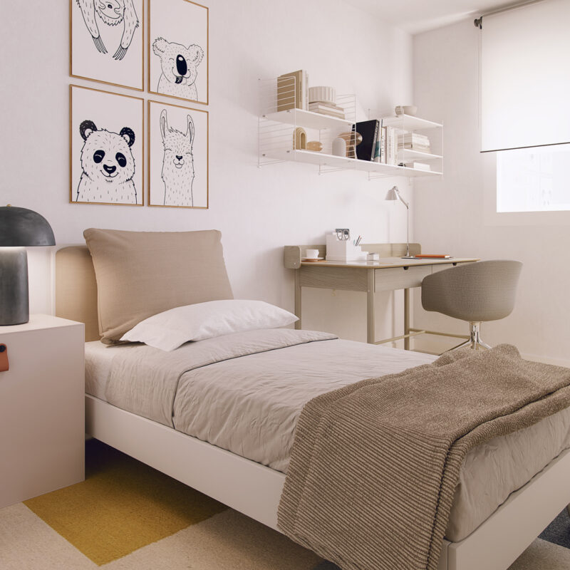 Un espacio de descanso que invita al confort. Habitaciones pensadas para tu bienestar, con acabados de alta calidad y diseño moderno. Despierta cada día en tu nuevo hogar Metrovacesa.